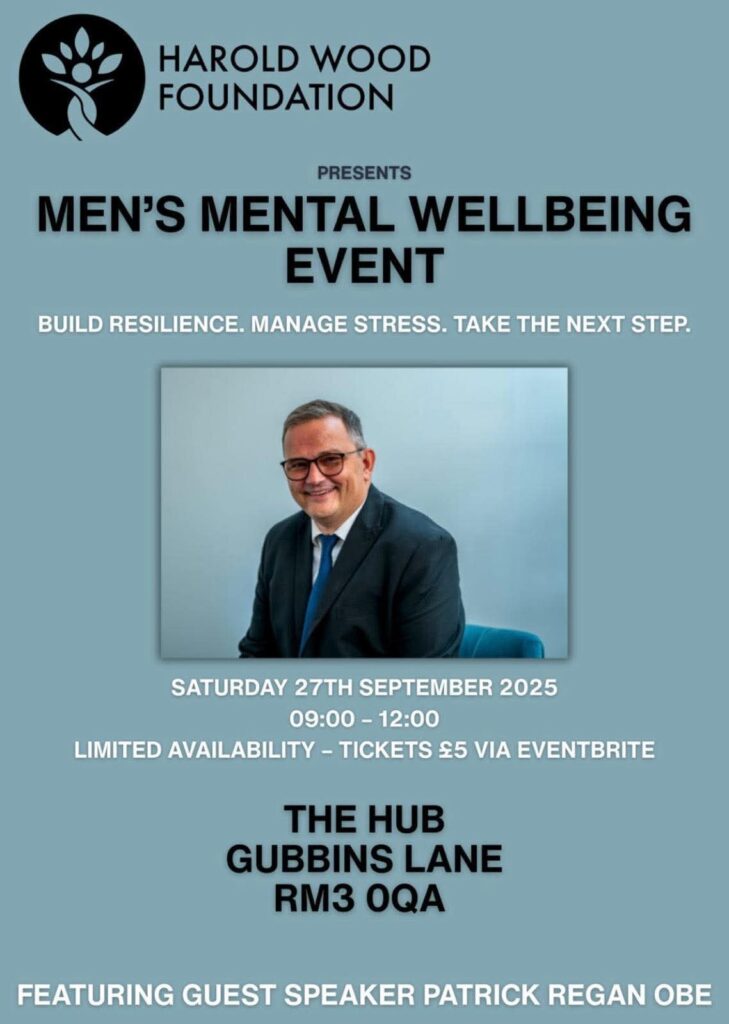 The Harold Wood Foundation is delighted to welcome you to a special men’s wellbeing event with renowned guest speaker Patrick Regan OBE. Patrick is a successful author and was knighted by thelate Queen Elizabeth ll for his contributions to Justice and Wellbeing. The event will focus on building resilience, managing stress and moving forward in life. There is limited availability and tickets can be obtained via Eventbrite.